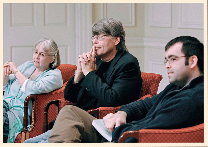 미국 작가 스티븐 킹(가운데)은 인류 역사상 가장 많은 영화의 원작자로 기네스북에 올랐다. 올해는 그의 데뷔 50주년이다. 왼쪽은 그의 아내 태비사 킹,오른쪽은 그의 아들 오언 킹. [황금가지] 하지만 그도 인간인지라 일탈과 불운은 함께 했다. 그는 알코올 중독에 코카인 중독이었다. 킹은 언덕 산책 중에 교통사고로 목숨을 잃을 뻔하기도 했다. 밴이 덮치자 킹의 무릎은 쪼개졌고 척추 8군데,엉덩관절 2군데,갈비뼈 4대가 박살이 났다. 토크쇼 호스트들은 “킹이 입원 동안 또 얼마나 많은 책을 쓸지 모른다”고 농담했다. 그의 진정한 고통은 단지 육체적 통증이 아니었다. 그날의 사고는 ‘창조적 충동’을 잃을 수 있는 일이었다.