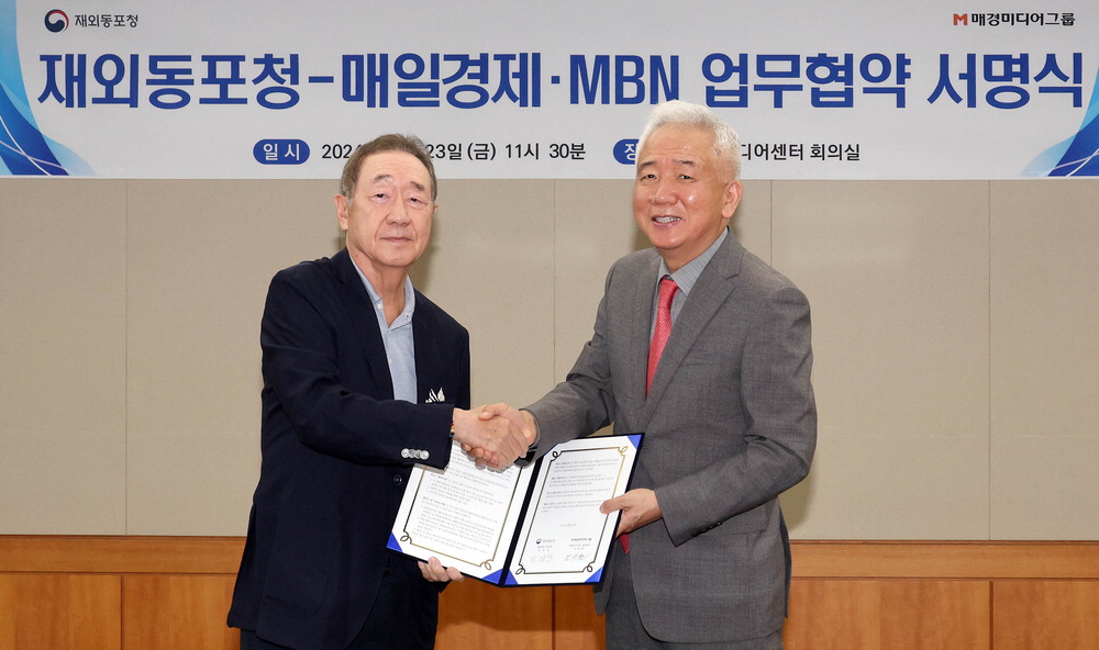 매일경제신문·MBN과 재외동포청이 제22차 세계한인비즈니스대회(세계한상대회) 개최를 위해 손을 잡았다. 재외동포청은 23일 서울 매경미디어센터에서 매일경제와 업무협약(MOU)을 체결했다고 밝혔다. 두 기관은 오는 10월 22~24일 전북 전주에서 열리는 세계한인비즈니스대회의 성공적 개최를 위해 협력하기로 했다. MOU에는 한상과 국내 중소기업 간 비즈니스 네트워킹의 장을 마련해 중소기업의 해외 진출을 지원한다는 내용 등이 담겼다.