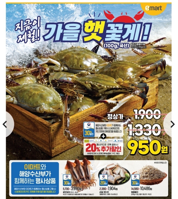 27일 유통업계에 따르면 이마트는 지난 24일부터 서울 용산·자양·왕십리·영등포·목동점,부천 중동점 등 수도권의 주요 점포에서 꽃게 가격을 100g당 최저 880원에 판매하고 있다. 이마트는 당초 지난 23일 가을꽃게 판매를 개시하면서 100g 950원에 판매한다고 밝혔고 전단지에도 950원을 표기했으나,이보다 가격을 70원 더 내린 것이다.
