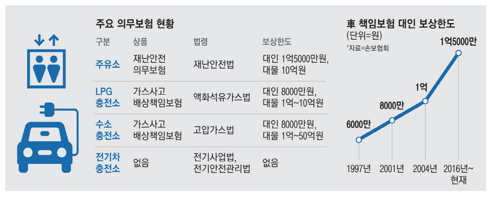 올 들어 화재·폭발,침수 등 대형 사고가 잇따르고 있지만 가스시설 등 일상과 밀접한 재난취약시설에서 인명피해를 대비해 가입하는 재난배상책임보험의 보상한도가 턱없이 낮은 것으로 나타났다. 주무부처가 관련 법령을 개정하지 않아 가스 사고와 승강기 안전사고 등의 보상한도가 행정안전부 권고의 절반 수준에 머물러 있다. 최근에는 전기차 안전 대책의 일환으로 전기차 충전시설도 배상책임보험 가입을 의무화해야 한다는 목소리가 높아지고 있다.