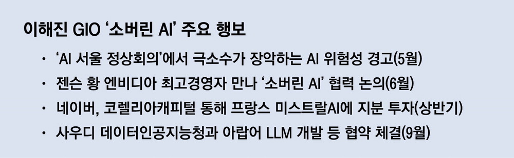 이 GIO는 지난 6월 세계 최대 반도체 기업 엔비디아의 젠슨 황 최고경영자(CEO)를 만난 자리에서도 소버린 AI 현안을 논의했다. 국가별 AI 모델 구축을 위한 하드웨어 인프라를 제공하는 엔비디아와 초거대 AI 모델 개발 원천 기술을 보유한 네이버의 시너지 효과 모색이 주요 안건이었다.