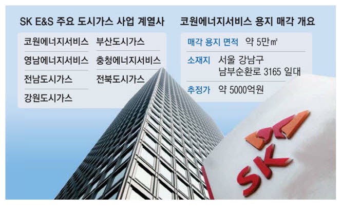 SK이노베이션과 합병을 진행 중인 SK E&S가 수도권 도시가스 사업 자회사인 코원에너지서비스의 서울 대치동 본사 용지 매각에 나선다. SK그룹 내 초대형 에너지 계열사 탄생을 앞두고 보유 자산을 유동화해 합병 자금을 확보하기 위한 것으로,향후 알짜 자산에 대한 매각이 본격화될 것으로 전망된다.
