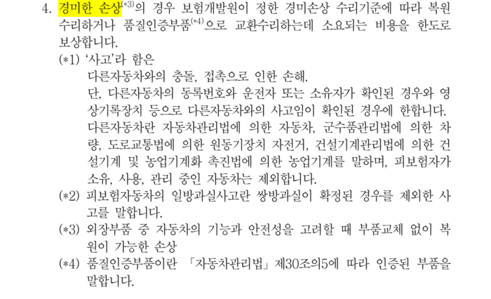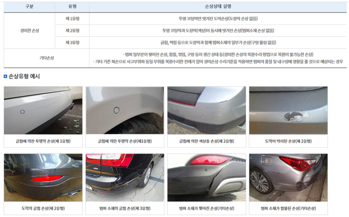 주차된 BMW 차량과 접촉사고. 범퍼에 작은 흠집이 보인다. BMW 차량은 범퍼 교체를 요구했다고 한다.[사진 제공 = 보배드림 캡처] “주차장에 주차된 BMW 차를 박은 제 잘못이고 제가 다 처리해 주는 게 맞아서 대물접수 후 진행할 예정입니다. 그런데 (차량을 접촉한 부분의) 범퍼 끝이 벗겨진 정도인데 범퍼를 교체해야 한다고 합니다. 범퍼는 파손 아니면 교체를 안 해주는 걸로 아는데…”(온라인 커뮤니티 보배드림 게시글)차량 접촉사고에 따른 ‘경미한 손상’ 시 범퍼 등을 통째 교체할 수 없도록 개정된 자동차보험 표준약관이 지난 2016년 7월 1일부터 시행되고 있습니다. 그러나 이처럼 현실에서는 표준약관 개정 이전 상황이 되풀이되고 있습니다.경미한 흠집에도 차량 부품을 교체하는 사례는 비단 온라인 커뮤니티뿐만 아니라 보험사 관계자들을 통해서도 전해집니다.흠집 하나 용납할 수 없을 정도로 자동차 사랑이 남다르기 때문일까요. 유럽 지역에서는 자동차 범퍼를 그 명칭처럼 충격 흡수 목적으로 보기 때문에 범퍼끼리 약간 부딪히더라도 대수롭지 않게 여긴다고 합니다.자동차 범퍼 손상 유형별 분류 기준.[자료 제공 = 보험개발원] 자동차보험 표준약관에는 복원수리비만 지급하는 경미한 손상의 범위를 보험개발원이 정한 기준에 따르도록 한다고 명시돼 있습니다. 경미한 손상은 자동차의 기능과 안전성을 고려했을 때 부품 교체 없이 외관상 복원이 가능한 경우로 정의합니다.예컨대 투명 코팅막만 벗겨진 도막손상(도장막 손상 없음),투명 코팅막과 도장막(색상)이 동시에 벗겨진 손상(범퍼소재 손상 없음),긁힘,찍힘 등으로 도장막과 함께 범퍼 소재의 일부가 손상(구멍 뚫림 없음)된 사례가 그것입니다.해당 유형 안에서 이뤄진 손상은 부품 교체비 대신 복원수리비만 지급하는 게 원칙입니다.불필요한 비용 발생으로 인한 선량한 자동차보험 가입자들의 보험료 인상을 막기 위한 최소한의 원칙인 셈이죠. 즉,범퍼가 찢어지거나 구멍이 나거나 휘어져 복구가 불가한 경우에 한해서만 교체를 해야 한다는 것입니다.경미한 손상에 대한 자동차보험 표준약관.[자료 제공 = 손해보험협회] 그럼 현실로 돌아가 볼까요.현실에선 경미한 손상의 범위에 해당함에도 범퍼를 통째로 교체하는 사례가 여전하다고 합니다. 유독 고가의 외제차들에서 빈번한 것으로 알려져 있습니다.개정된 자동차보험 표준약관이 제 기능을 온전히 못하는 셈입니다. 보험사 관계자조차도 자신 역시 접촉사고로 인한 경미한 범퍼 손상에 판금이 아닌 통째 교체를 진행했다고 고백할 정도니까요. 약관 따로 현실 따로 입니다.경미한 손상에 대해 복원이 아닌 부품 교체를 진행한 경우 그 이유를 들어보면 겉으로 보이는 것과 달리 센서가 고장 나 전체 교체가 불가피했다는 설명이 으레 따라 붙기도 합니다.관계자들의 말을 종합하면 경미해 보이는 흠집에도 센서 문제로 이런 경우가 예외적으로 발생하기도 하지만 대부분은 사고 차량 피해자의 의지(?)로 범퍼 등 부품이 교체되는 경우가 많다고 합니다.소위 공식 AS센터로 불리는 곳에서 사고 부위에 대한 복원이 아닌 교체로만 진행하는 것도 문제로 지적됩니다. 사고가 나면 피해 차량 차주가 원하는 곳에 차량을 맡겨 수리를 진행할 수 있는데,공업사가 아닌 공식 AS센터에선 문제가 된 부분을 통째 교체하는 방식으로 보험사고를 처리하고 있다고 합니다.온전히 피해 차량 차주 입장에서 생각한다면 사고 부위을 판금·도색보다는 교체하는 게 추후 불량 등에 따른 우려가 덜하다는 인식이 많아 부품 교체로 진행하는 공식 AS센터에 맡기는 경향이 있다고 합니다. 그러나 최근에는 판금·도색 기술이 좋아져 공업사에 차량을 맡겨도 이런 염려를 크게 할 필요가 없다는 목소리도 나옵니다.여하튼 작은 흠집에도 범퍼 등을 통째 교체하는 사례가 여전해 보험금 누수가 되풀이되고 있습니다.한편,접촉사고 시 외제차의 경우 차량 수리기간 동안 렌트 비용을 동일 배기량,동일 연식의 국산차를 기준으로 지급할 수 있는 근거가 담긴 개정 자동차보험 표준약관은 잘 지켜지고 있다고 합니다.관련해 시행 초기에는 정착이 잘 안됐지만 사고 차량과 동일한 외체차를 렌트하는 것에 따른 과도한 비용이 나가는 것에 대해 보험사들이 자동차보험 표준약관을 근거로 렌터카 회사들을 상대로 한 소송에서 승소하는 사례가 잇따르면서 업계 내에서 자발적으로 지켜지고 있다고 합니다.