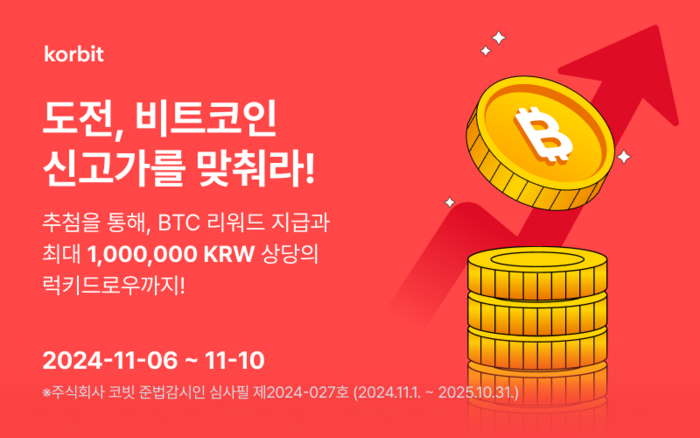 코빗은 ‘도전! 비트코인 신고가 예측 이벤트’를 진행한다고 8일 밝혔다. <사진=코빗> 코빗은 신규 가입 후 최대 1만5000원을 얻을 수 있는 행사를 진행하고 있다. 신한은행 계좌연동을 한 고객을 대상으로 5000원을 증정한다. 신규 가입 후 가상자산을 1만원 이상 매수하면 5000원을 추가 지급한다. 친구 추천 리워드를 통해서 5000원을 추가로 얻을 수 있다.