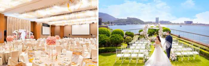 그랜드 볼룸 / 사진=쉐라톤 호텔 퉁청 여기서 끝이 아니다. 호텔 관계자에 따르면 이 호텔은 란터우섬 내 인기 결혼식장으로 통한다. 2층에 약 1300명을 수용할 수 있는 3400㎡ 규모의 결혼식장인 그랜드 볼룸이 있다. 이 그랜드 볼룸 옆에 있는 야외 테라스는 결혼 사진 명소다. 270°로 바다를 조망할 수 있는 구조라 대충 찍어도 인생 사진을 건질 수 있다고. 결혼식 등 행사가 없는 날에는 일반 투숙객 역시 자유롭게 출입해 기념사진을 남길 수 있다. 그밖에 4개의 다기능 회의실도 식장 옆에 딸려 있다.