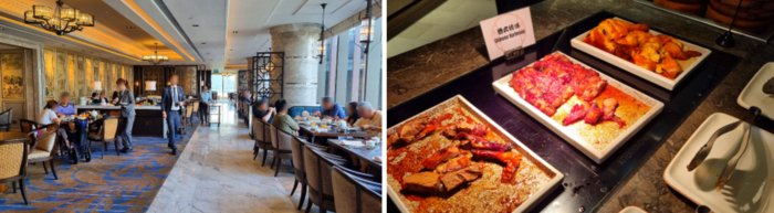 예 식당과 조식 뷔페 / 사진=쉐라톤 호텔 퉁청 이 호텔에는 예,선셋 그릴,카페 란터우 등 식당 세 곳이 있다. 예는 현대식 중국 요리 식당으로 광둥식 및 중국 남부식 요리를 주로 선보인다. 조식 역시 이곳에서 뷔페식으로 즐길 수 있는데 중국식 바비큐,사오마이 딤섬 등 다양한 현지 요리를 내놓는다. 카페 란터우는 세계 각국의 요리를 맛볼 수 있는 식당이다.