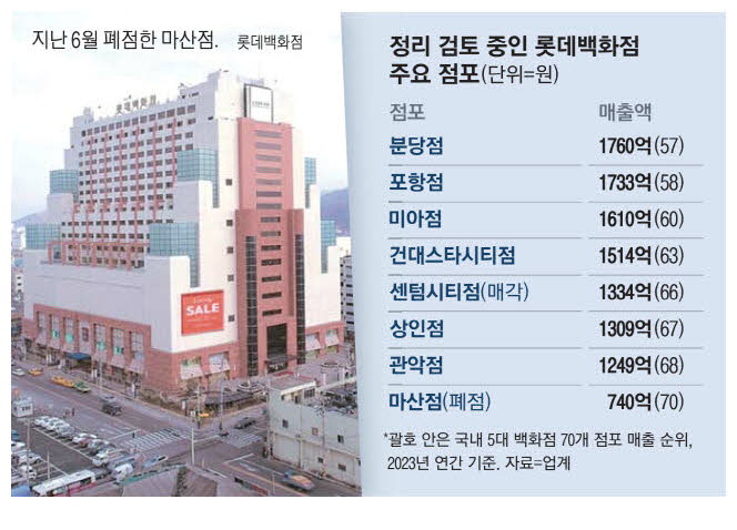 25일 업계에 따르면 롯데백화점은 관악점·상인점·분당점·일산점·대구점 등 매출 하위권 10여 개 점포에 대해 구조조정을 검토하고 있다. 롯데백화점 32개 점포 가운데 매출 전국 꼴찌인 마산점은 지난 6월 폐점을 결정했다. 센텀시티점은 최근 매각을 추진한다고 공개했다.