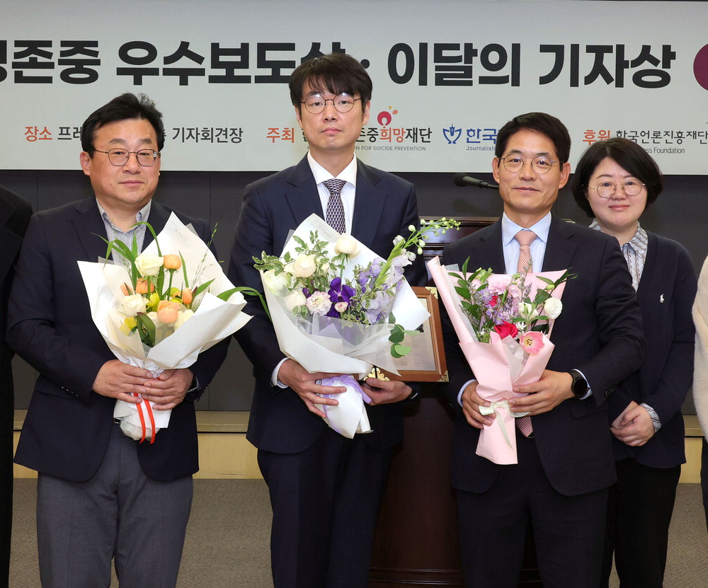 '2024 노벨문학상 수상 한강 인터뷰' 단독 기사를 쓴 김유태 매일경제 문화스포츠부 기자가 27일 서울 중구 한국프레스센터에서 제410회 이달의 기자상 전문보도 부문을 수상했다. 왼쪽부터 박종현 기자협회장,김유태 기자,김대영 편집국장,전지현 문화스포츠부장. 이승환 기자