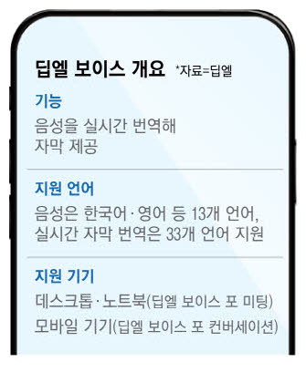 딥엘 보이스는 '보이스 포 미팅'과 '보이스 포 컨버세이션' 두 가지 모델로 출시된다. 두 모델은 비대면 대화(보이스 포 미팅)와 대면 대화(보이스 포 컨버세이션)에서 다국어로 실시간 번역 서비스를 제공한다. 한국어,영어,독일어,일본어,프랑스어 등 13개 언어의 음성 번역을 지원하며 실시간 자막 번역은 딥엘 번역기에서 지원하는 33개 언어 모두 적용된다.