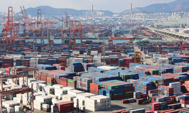 부산항에 수출입 화물이 쌓여있는 모습. [사진출처 = 연합뉴스] 올해에 이어 내년에도 경기 한파가 이어질 것으로 전망된다.