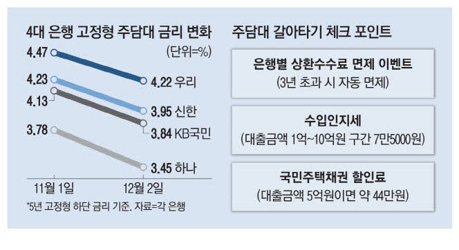 결국 차주가 향후 금리 방향을 어떻게 보는지가 갈아타기 여부의 관건이 될 것 같다. 내년에 금리가 현재보다 훨씬 더 가파르게 떨어질 것으로 예상한다면 대환대출 시기를 미루는 편이 좋을 수 있다. 하지만 향후 금리 인하폭에 따른 상환 이자 감소분보다 올해 중도상환수수료 면제 등으로 얻을 비용 절약분이 더 크다고 본다면 이달 안에 중도상환을 하는 편이 나을 수 있다.