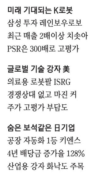 이들의 투자 확대가 한·미·일 레거시 로봇주의 실적 기대감 상승으로 이어지고 있다. 레거시 주식으로 레인보우로보틱스,두산로보틱스 등 'K로봇주'는 물론 미국 의료용 '로봇팔' 기업 인튜이티브서지컬(주식명 ISRG)과 자동 이동 로봇사 테라다인,일본 공장 자동화 1등 기업 키엔스와 산업용 로봇 세계 1등 화낙 등이 향후 '로봇 전성시대'의 최대 수혜주로 꼽힌다. 이들 6대주는 주요 국내외 로봇 관련 ETF에 중복으로 포함돼 있다.