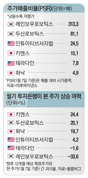 두산그룹이 사업 개편 과정에서 두산로보틱스 아래에 '캐시카우(현금 창출원)'인 두산밥캣을 자회사로 놓으려 했으나 무산되면서 이젠 두산로보틱스 스스로 수익성을 높여 주주들을 만족시켜야 하는 숙제를 안게 됐다. 증권가 관계자는 "K로봇주의 경우 적자여서 주가수익비율(PER)은 측정 불가이고,PSR도 지나치게 높아 단기 주가 변동 리스크가 높은 편"이라고 전했다.