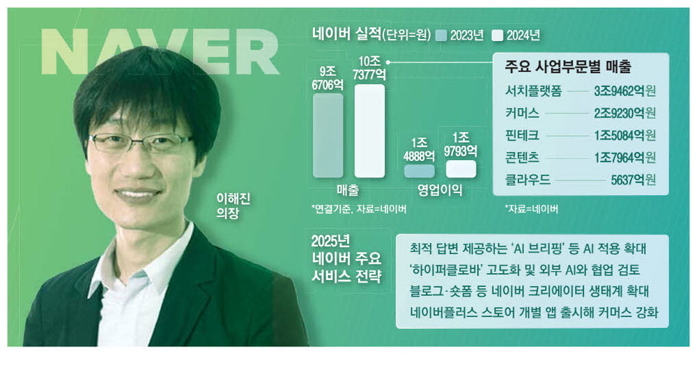 서치플랫폼 사업은 이용자들의 체류 시간 증가와 신규 광고 지면 확대에 힘입어 지난해 3조9462억원의 매출을 올리며 2023년 대비 9.9% 성장했다. 커머스 매출은 구독자 혜택을 강화한 네이버플러스 스토어 출시,넷플릭스와의 멤버십 제휴 등을 통해 경쟁력을 높인 덕에 같은 기간 14.8% 증가한 2조9230억원을 기록했다. 두 핵심 사업은 지난해 네이버 전체 매출에서 64%를 책임졌다.