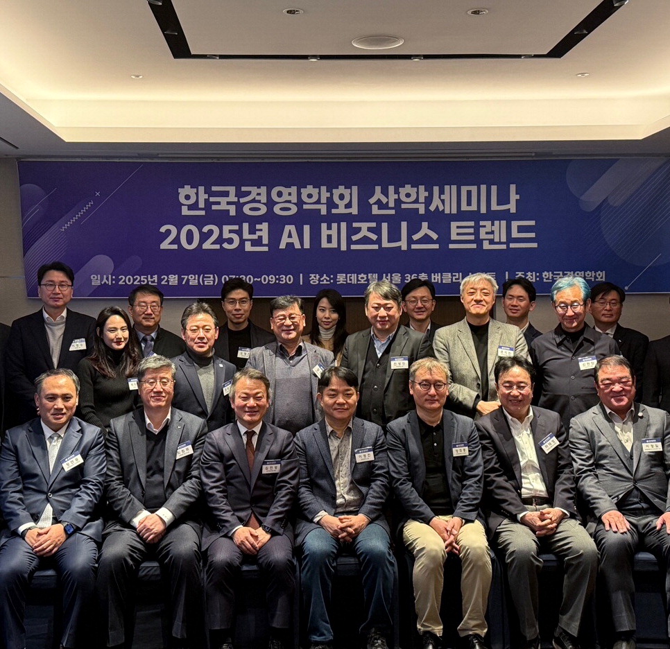 7일 서울 중구 롯데호텔에서 '2025년 AI 비즈니스 트렌드'를 주제로 개최된 한국경영학회 산학세미나에서 참석자들이 기념촬영을 하고 있다. 앞줄 왼쪽부터 정연승 한국경영학회 수석부회장,최원목 신용보증기금 이사장,김연성 한국경영학회 회장,이경전 경희대 경영학과 교수,양희동 한국경영학회 차기 회장,하태형 미코그룹 부회장,이정일 삼성글로벌리서치 상근고문. 한국경영학회