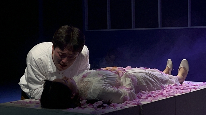 ‘로미오 와줄리엣’에는 원작의 정수를 살린 진지한 장면도 존재한다. 줄리엣의 무덤을 찾은 로미오가 연인의 몸을 덮은 천을 걷을 때 로즈마리 꽃잎들이 허공에 흩날리고,사랑하는 이가 잠든 곁에서 로미오는 창자가 끊어지는 슬픔을 토해낸다. 내달 9일까지 서울 대학로 한성아트홀 1관.
