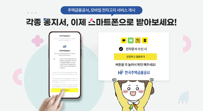 한국주택금융공사는 공사에서 발송하는 통지서와 안내장 등 고지문을 고객 본인 명의의 휴대전화로 발송하는 ‘전자고지 서비스’를 시행한다고 4일 밝혔다. <사진=한국주택금융공사> 한국주택금융공사에서 우편으로 받던 주택연금 이용현황 등 각종 안내사항을 전자문서로 받을 수 있게 됐다.