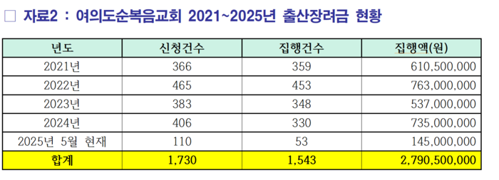여의도순복음교회는 지난 2012년부터 출산 장려금을 지급하고 있다. 2021년부터 2025년 5월 현재까지 총 27억9000여만의 장려금을 지급했다.