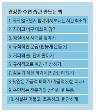 윤창호 분당서울대병원 신경과 교수는 “잠을 잘 잔다는 것은 수면의 양뿐만 아니라 리듬도 포함하는 개념”이라며 “주중,주말 가리지 않고 비슷한 시간에 잠자리에 들고 일어나는 것이 중요하다”고 말했다. 이어 “꼭 7~8시간을 자야 하는 것은 아니지만 각자에게 맞는 충분한 수면 시간을 찾아 규칙적으로 유지하는 것이 좋다”고 덧붙였다.