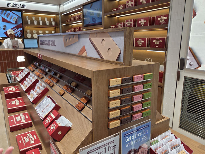 테이스트 오브 신세계 디저트 존에는 국내 면세점 최초로 브릭샌드가 입점했다. [김혜진 기자] 디저트 존에는 국내 면세점 최초로 입점한 브릭샌드와 그래인스 쿠기가 입점했다. 브릭샌드는 벽돌 모양 휘낭시에에 버터 향을 입힌 제과 브랜드다. 이곳에서 만난 조헌기 브릭샌드 대표는 “서울을 대표하는 선물용 디저트로,1~2년 안에 해외진출을 하는 게 목표인데,면세점이 그 발판이 될 것 같아 입점했다”며 “면세점 전용 상품으로 메론맛과 불닭맛을 출시할 예정”이라고 말했다.