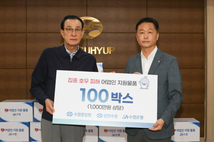 노동진 수협중앙회장(왼쪽)이 24일 송민수 당진수협 조합장에게 1천만 원 상당의 집중 호우 피해 어업인 지원 물품을 전달하고 있다.<수협> 수협중앙회(회장 노동진)가 집중호우 피해지역에 신속한 복구 지원을 시행한다.