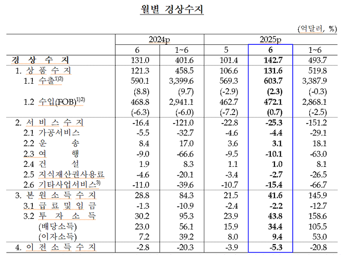 [속보] 6월 한국 경상수지 142.7억달러…26개월 연속 흑자