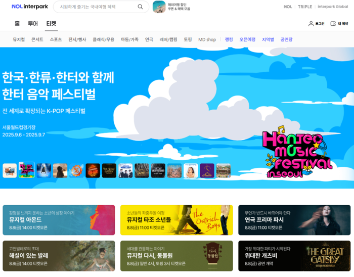 놀 티켓 홈페이지 캡쳐 / 사진=놀유니버스 문화예술 향유 기회를 확대하고자 마련한 사업인 만큼 놀 티켓은 누구나 부담 없이 문화생활을 즐길 수 있도록 다채로운 행사를 함께 전개한다. 먼저,8월 말까지 공연 및 전시 예매 시 사용 가능한 3000원 할인권을 선착순으로 제공한다. 이밖에도 매일 뮤지컬과 연극 등 대표 공연을 엄선해 특가로 판매하는 시간 한정 할인 행사를 선보인다.