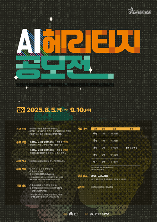 < 출처 : 공주시 > 공주시(시장 최원철)는 2025 디지털헤리티지페스타의 일환으로 생성형 AI를 활용한 ‘AI 헤리티지 공모전’을 개최한다고 밝혔다.
