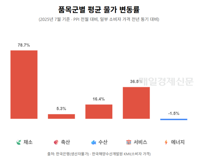 전월대비 등락률을 품목별로 보면 농산물(8.9%),축산물(3.8%) 등을 포함한 농림수산품이 5.6% 높아졌다. 지난 2023년 8월(7.2%) 이후 1년 11개월 만에 최대폭 상승이다.