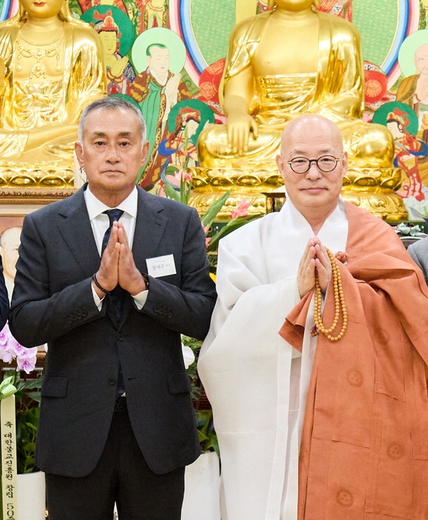 '대원 장경호 거사 50주기 추모 법회'에 참석한 장세주 동국제강 회장(왼쪽),대한불교조계종 총무원장 진우 스님. 동국제강