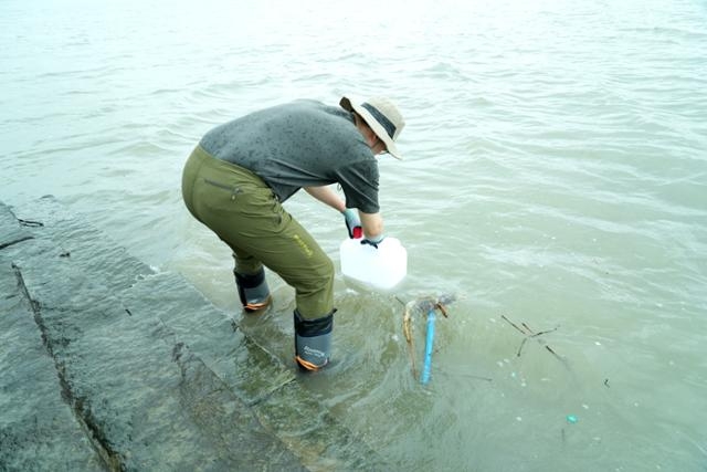 한국원자력안전기술원(KINS) 전문가가 인천 강화도 해안에서 시료를 채취하고 있다. [사진=원자력안전위원회] 정부는 19일 북한 평산 우라늄공장 폐수 방류 우려와 관련한 정기모니터링 결과,지금까지와 동일하게 이상 없음을 확인했다고 밝혔다.