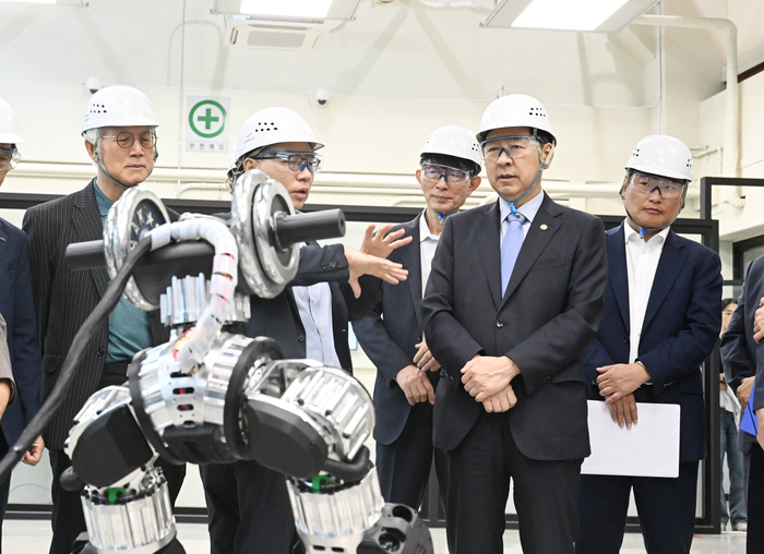 (서울=뉴스1) = 구윤철 경제부총리 겸 기획재정부 장관이 19일 대전시 유성구 카이스트 AI 팩토리 랩을 방문해 설명을 듣고 있다. (기획재정부 제공. 재판매 및 DB 금지) 2025.9.19/뉴스1 정부가 전통적인 공장 500개를 ‘인공지능(AI) 선도공장’으로 전환하는 대규모 프로젝트에 시동을 거다. 또 최대 10조원 규모의 전용보험 상품과 같은 대규모 금융지원을 병행한다. 이를 통해 제조업 전반에 AI를 접목해 AI 도입률을 40%까지 끌어올린다는 방침이다.