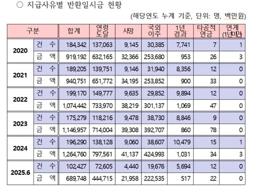 [사진 = 연합뉴스] 올해 상반기 국민연금 반환일시금 수령자가 10만명을 넘어섰다. 금액으로는 7000억원에 달하는 수준이다.국민연금 반환일시금 제도는 (과거)가입자가 연금 급여의 수급 요건을 채우지 못한 상태로 자격을 상실하고 향후 재가입 가능성도 희박한 경우 납부한 보험료를 돌려주고 법률관계를 끝내는 것이다.대표적으로 최소 가입 기간인 10년을 채우지 못한 가입자가 의무가입 상한 연령인 60세가 되는 경우 등이 있다.25일 국회 보건복지위원회 서명옥 의원실이 국민연금공단으로부터 받은 자료에 따르면 올해 1∼6월 국민연금 반환일시금은 총 6897억4800만원,총 지급건수(인원)는 10만2427건이었다.지난해 총 지급금액(1조2647억6000만원)과 지급건수(19만6290건)의 절반을 이미 넘긴 수치다.최근 5년간 국민연금 반환일시금은 2020년 9191억9200만원에서 상승곡선을 그리며 2020년부터 올해 상반기까지의 지급금은 6조원을 넘었다.올 상반기 반환일시금을 사유별로 보면 연령 도달로 인해 반환 지급된 금액이 4447억1500만원,7만2605건으로 가장 높은 비중을 차지했다.국외 이주로 인한 지급금은 2225억3500만원(1만9676건),사망으로 인한 지급금은 219억5800만원(4440건)이었다.상반기의 반환일시금 최고 금액은 1억4229만6840원이었고 최저 금액은 4390원이었다.반환일시금을 가장 많이 받아간 금액 기준 상위 100명의 지급 사유는 대부분(95명) 국외 이주였으나 가장 적게 받아간 하위 100명의 지급 사유는 대부분(82명) 연령 도달로 인한 것이었다.