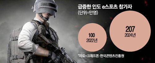 28일 크래프톤과 한국콘텐츠진흥원에 따르면 크래프톤이 2021년 게임 '배틀그라운드 모바일 인디아(BGMI)'를 출시한 이후 인도의 e스포츠 참가자 수가 2022년 100만명에서 지난해 207만명으로 두 배 이상 증가한 것으로 나타났다. 이러한 인도 e스포츠 시장의 급성장에 크래프톤의 BGMI가 주 역할을 했다는 분석이다. 크래프톤 인도 법인은 BGMI 게임 출시와 함께 비슷한 시기에 해당 게임의 아마추어 대회인 BGIS와 프로 구단 중심의 BMPS 등 두 개의 대회를 시작했다. BGIS 대회는 올해 유튜브를 통한 순 시청자 수만 지난해보다 20% 이상 증가한 3439만명을 기록했으며,현장 관객도 3만명을 넘어섰다.