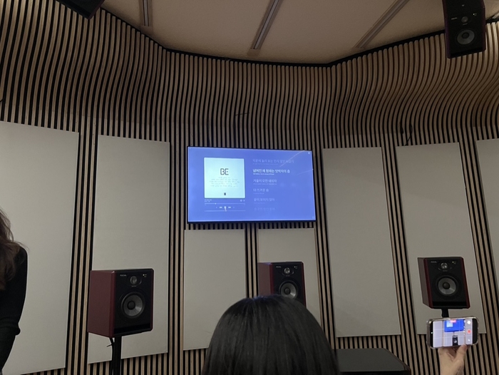 16일 애플이 서울 서초구 사운드360 녹음실에서 애플뮤직 신기능을 선보이고 있다. 김대은 기자 애플뮤직에서 아일릿의 ‘빌려온 고양이’를 재생하자 재생 목록 하단에 ‘Mixing’이라는 글자가 나타났다. 곡이 끝나갈 무렵 분위기가 비슷한 트와이스의 ‘This is For’로 자연스럽게 연결됐다. 두 노래를 모르는 사람이라면 마치 하나의 곡처럼 들릴 정도였다.