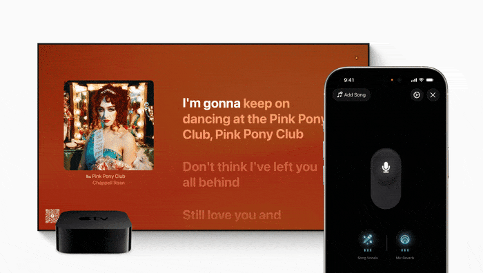 애플뮤직 번역 기능. 애플 이번에 업데이트된 기능 중 눈에 띄는 것은 싱(Sing)이라는 이름의 노래방 기능이다. TV 화면에 가사를 띄워놓고 아이폰으로 QR 코드를 찍어 연동하면 아이폰을 마이크로 활용할 수 있다.