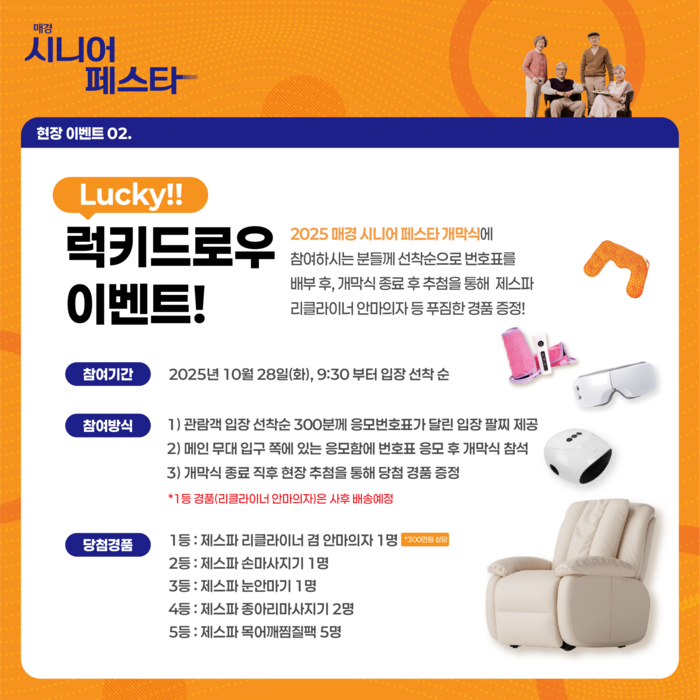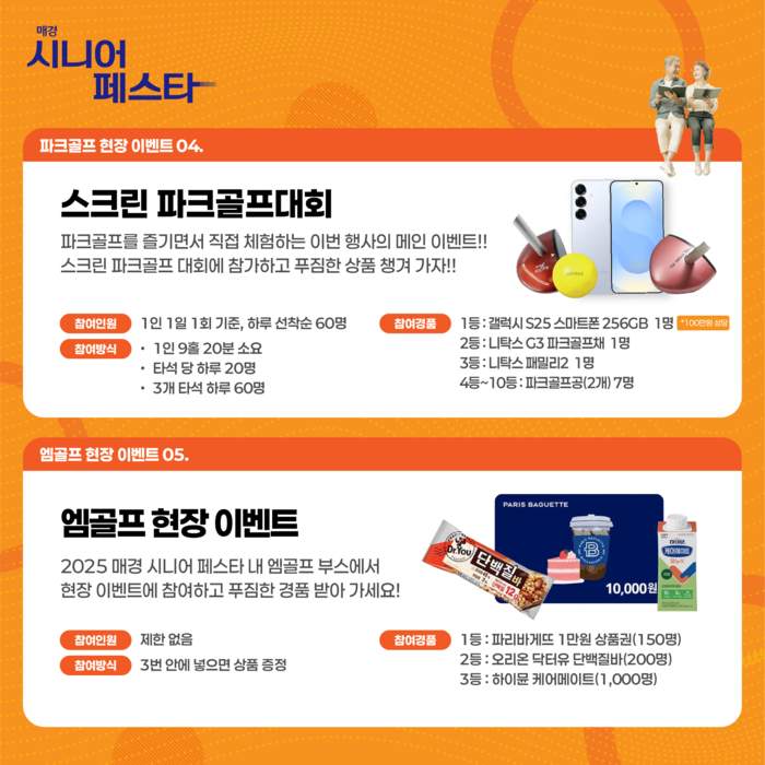 한편 매경 시니어 페스타에선 파크골프대회 외에도 얼리버드 오픈런,럭키드로우 등 다채로운 경품을 얻을 수 있는 이벤트가 풍성하다.