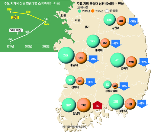 청년들이 주요 고객이었던 지방 국립대 상권도 빠르게 쇠퇴하고 있다. 전문가들은 △대한민국의 빠른 고령화 △청년 세대의 지방 엑소더스(대탈출) △학령인구 감소 등이 맞물린 결과로 보고 있다.
