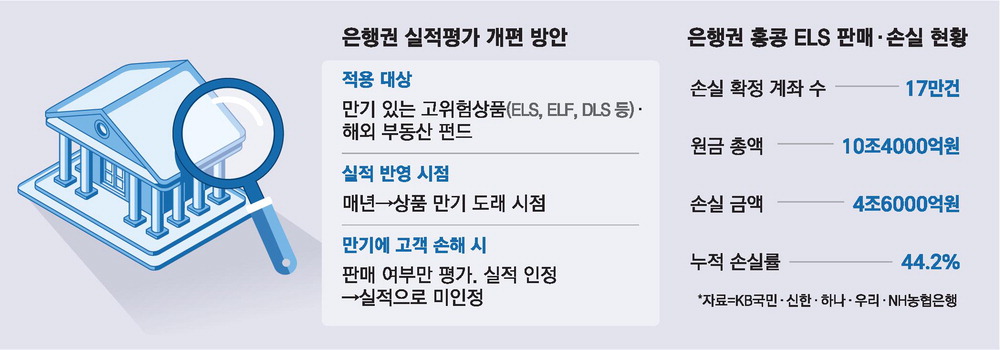 앞으로 은행 직원이 홍콩H지수 주가연계증권(ELS) 같은 고위험상품을 파는 경우 고객이 만기 때 손해를 보면 판매 실적으로 인정받을 수 없게 된다. 이를 위해 실적 반영 시점도 판매한 해가 아니라 상품의 만기가 도래하는 해로 바뀔 예정이다.