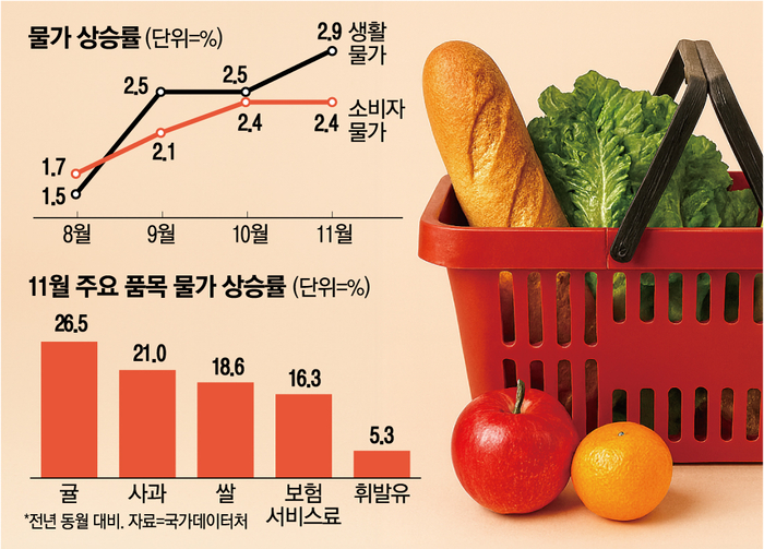 2일 국가데이터처가 발표한 ‘11월 소비자물가 동향’에 따르면,지난달 소비자물가는 1년 전 대비 2.4% 상승했다. 특히 농축수산물 물가는 5.6% 급등하면서,전체 물가를 0.42%포인트 정도 견인했다. 농축수산물 품목별로 살펴보면 귤·사과·쌀이 각각 26.5%,21.0%,18.6% 급등했다.