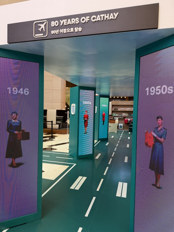 캐세이 팝업 런웨이 전시. /사진= 강예신 여행+ 기자 팝업 스토어 입구 들어서면 캐세이의 80년 여정을 한눈에 볼 수 있는 ‘런웨이’ 전시가 관람객을 맞이한다. 어느 층에서도 내려다볼 수 있도록 설계했으며 시대별 승무원 유니폼 등을 통해 브랜드의 헤리티지를 고스란히 전달한다.