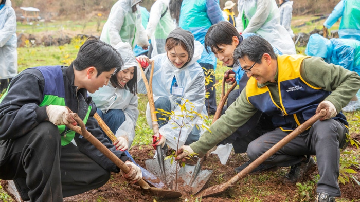 환경 보호 활동 참여자들이 함께 나무를 심고 있는 모습/사진=진에어 진에어가 환경 보호 활동의 일환으로 제주 곶자왈에 나무 500그루를 심었다.